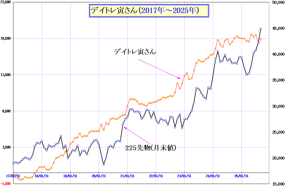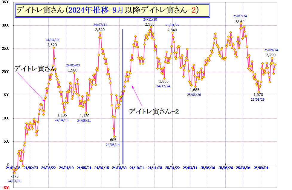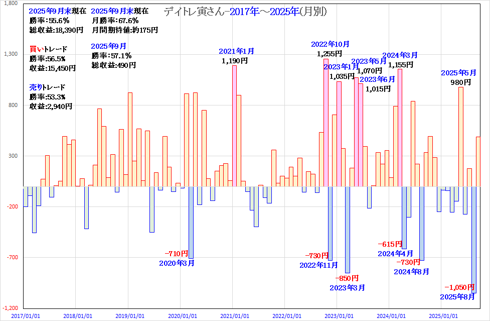 デイトレ寅さん-2(自動売買)2025/9報告 投稿日: 2025年10月6日2025年10月6日 投稿者: h_nagahama 2024年9月以降、デイトレ寅さん-2としてきましたが、今年(2025年)を含めて取って、取られの繰り返し。完全自動売買&完全デイトレにて儲ける事が如何に困難か・・・開発に丸5年の時間を費やしていますが、 2025年9月よりデイトレ寅さん-3の開発を本格化しています。 皆さんに堂々とお披露目するには、もう少し儲かるシステムでなければなりませんから・・・もう一度、突き詰めてみます。