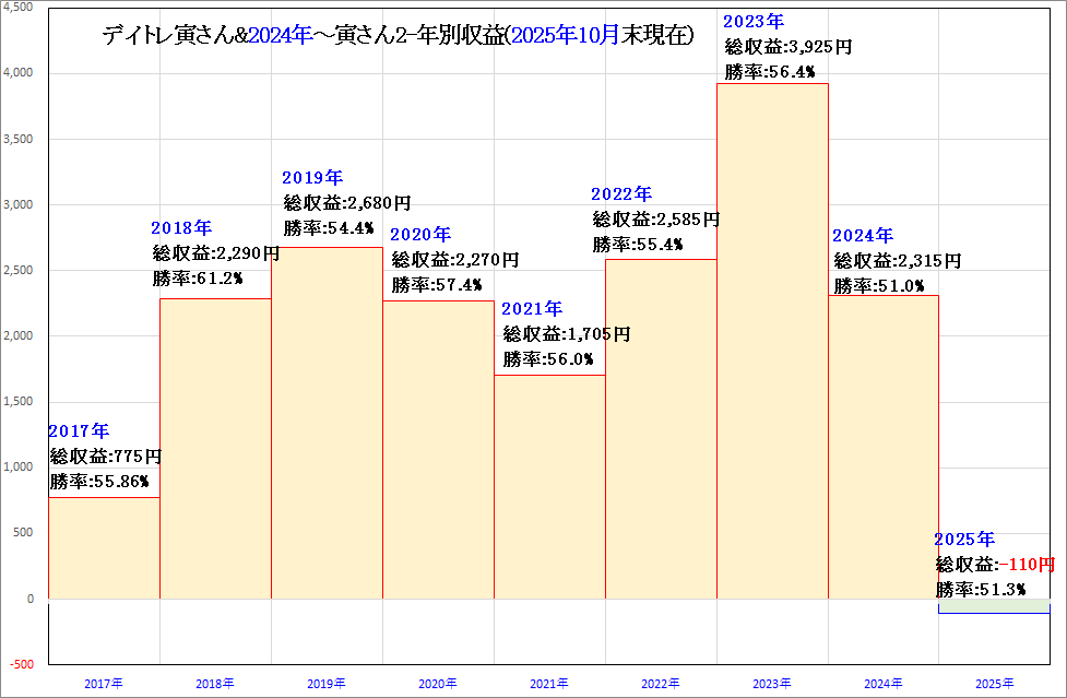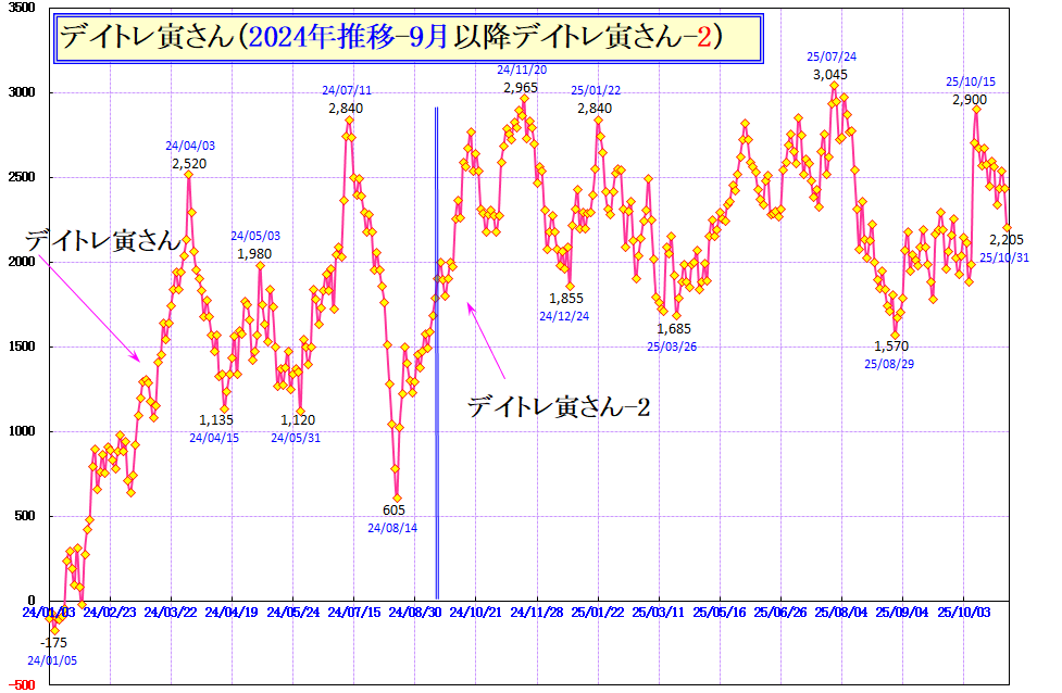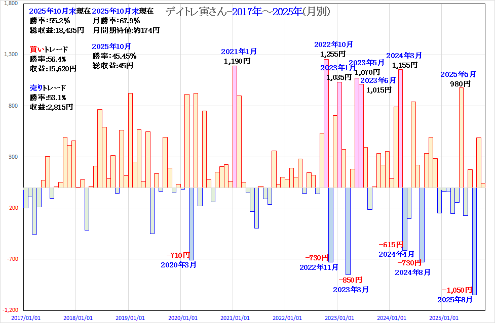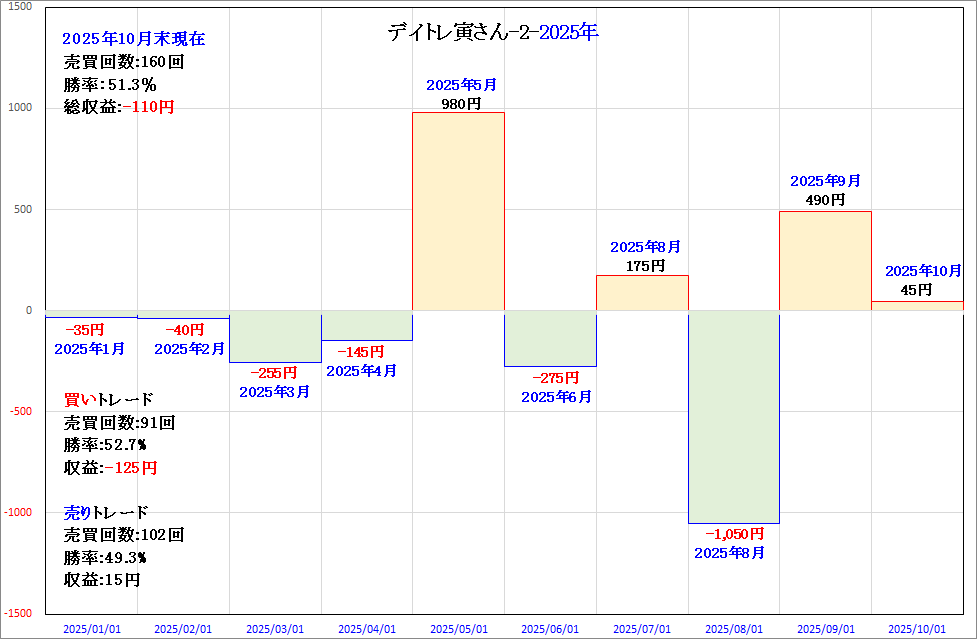 ちなみにデイトレ寅さん-2の過去データについて、2024年以降は実戦データを掲載していますが今年(2025年)はココまでマイナス110円の収益内容。残り2ヶ月間、プラスに転換できるか?まずは様子を見て行きます。