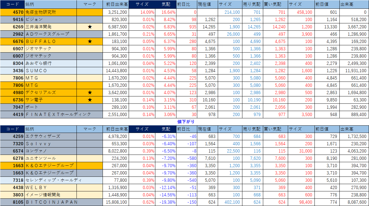 ホット銘柄-上げ銘柄&下げ銘柄(2025/11/14-前引け後) 投稿日: 2025年11月14日 投稿者: h_nagahama 「★」は昨日時点で注目した銘柄、「値上がり」にあれば伸びており、「値下がり」にあれば押しを形成している可能性。※銘柄の重複はお気にされずに。