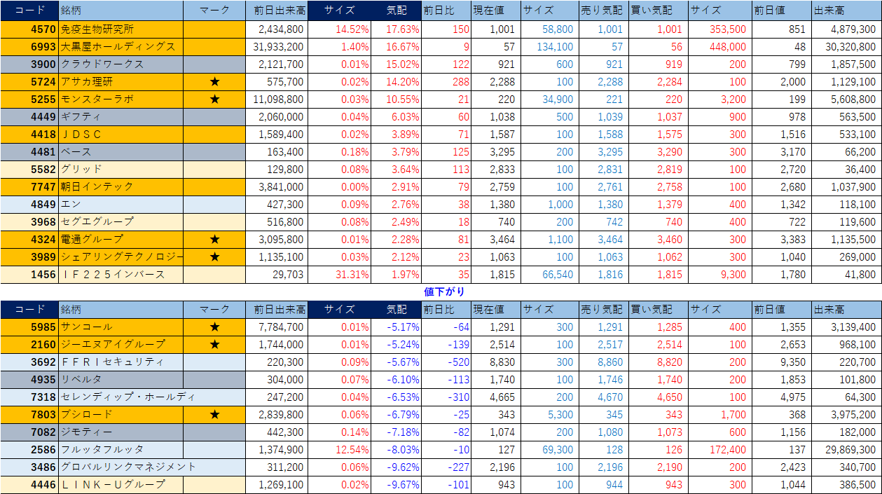 ホット銘柄-上げ銘柄&下げ銘柄(2025/11/18-前引け後) 投稿日: 2025年11月18日 投稿者: h_nagahama 「★」は昨日時点で注目した銘柄、「値上がり」にあれば伸びており、「値下がり」にあれば押しを形成している可能性。※銘柄の重複はお気にされずに。