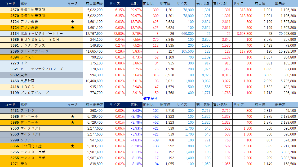 ホット銘柄-上げ銘柄&下げ銘柄(2025/11/19-前引け後) 投稿日: 2025年11月19日 投稿者: h_nagahama 「★」は昨日時点で注目した銘柄、「値上がり」にあれば伸びており、「値下がり」にあれば押しを形成している可能性。※銘柄の重複はお気にされずに。