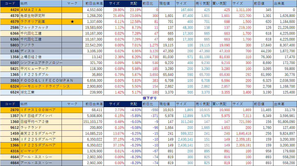 ホット銘柄-上げ銘柄&下げ銘柄(2025/11/20-前引け後) 投稿日: 2025年11月20日 投稿者: h_nagahama 「★」は昨日時点で注目した銘柄、「値上がり」にあれば伸びており、「値下がり」にあれば押しを形成している可能性。※銘柄の重複はお気にされずに。