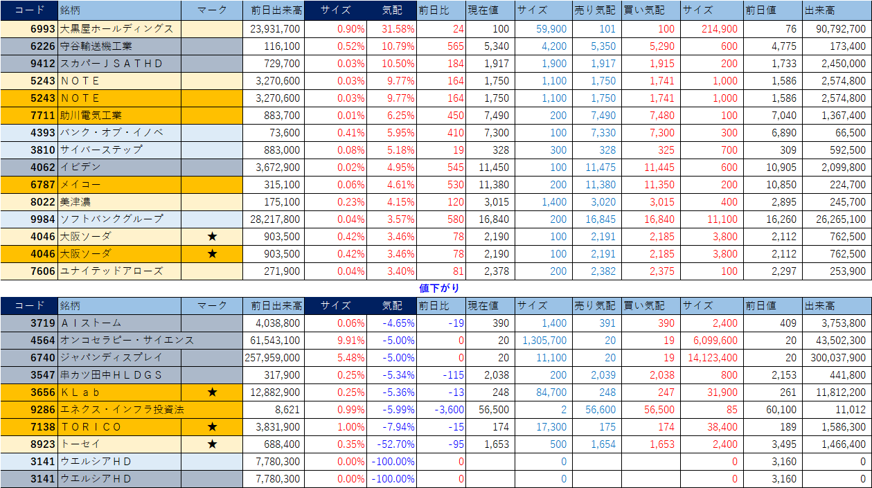 ホット銘柄-上げ銘柄&下げ銘柄(2025/11/27-大引け後) 投稿日: 2025年11月27日2025年11月27日 投稿者: h_nagahama 「★」は昨日時点で注目した銘柄、「値上がり」にあれば伸びており、「値下がり」にあれば押しを形成している可能性。※銘柄の重複はお気にされずに。