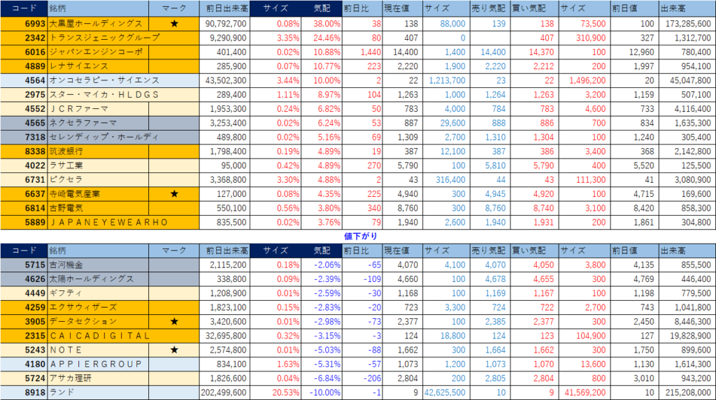 ホット銘柄-上げ銘柄&下げ銘柄(2025/11/28-大引け後) 投稿日: 2025年11月28日 投稿者: h_nagahama 「★」は昨日時点で注目した銘柄、「値上がり」にあれば伸びており、「値下がり」にあれば押しを形成している可能性。※銘柄の重複はお気にされずに。