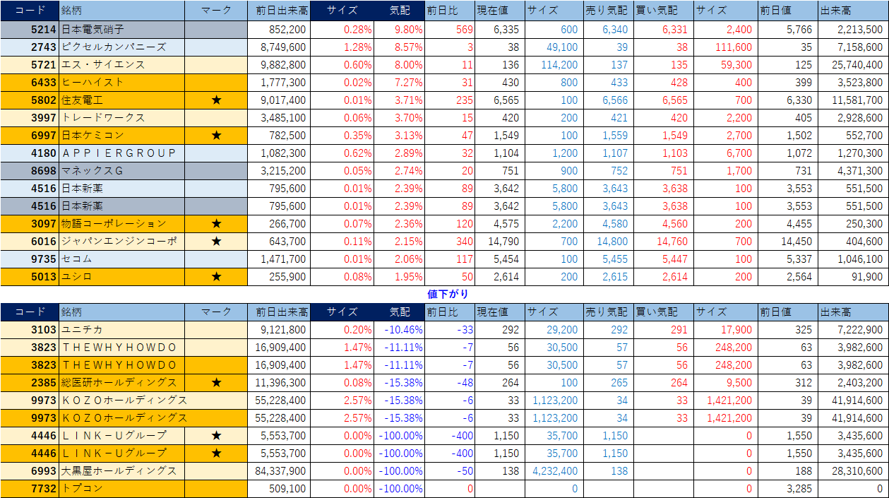 ホット銘柄-上げ銘柄&下げ銘柄(2025/12/02-大引け後) 投稿日: 2025年12月2日 投稿者: h_nagahama 「★」は昨日時点で注目した銘柄、「値上がり」にあれば伸びており、「値下がり」にあれば押しを形成している可能性。※銘柄の重複はお気にされずに。