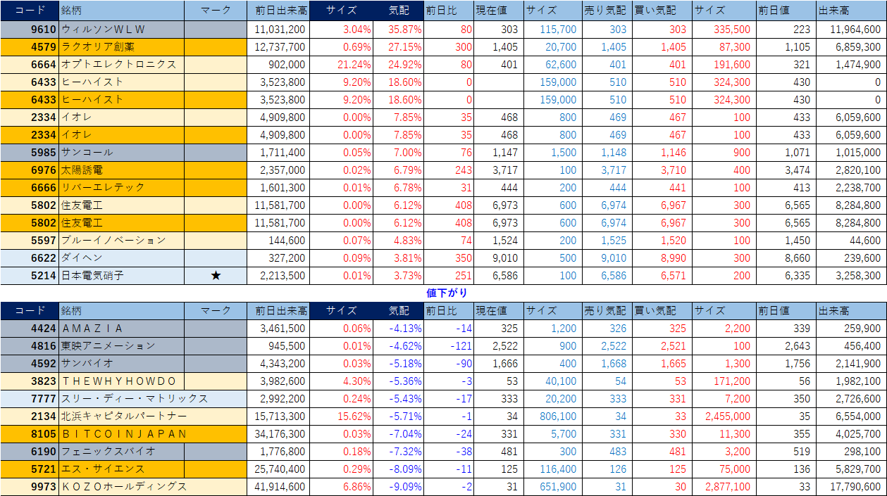 ホット銘柄-上げ銘柄&下げ銘柄(2025/12/03-前引け後) 投稿日: 2025年12月3日2025年12月3日 投稿者: h_nagahama 「★」は昨日時点で注目した銘柄、「値上がり」にあれば伸びており、「値下がり」にあれば押しを形成している可能性。※銘柄の重複はお気にされずに。