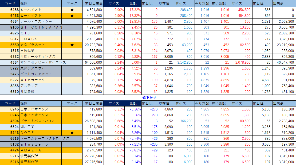 「★」は昨日時点で注目した銘柄、「値上がり」にあれば伸びており、「値下がり」にあれば押しを形成している可能性。※銘柄の重複はお気にされずに。