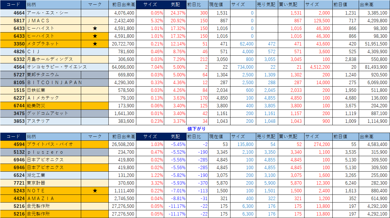 「★」は昨日時点で注目した銘柄、「値上がり」にあれば伸びており、「値下がり」にあれば押しを形成している可能性。※銘柄の重複はお気にされずに。