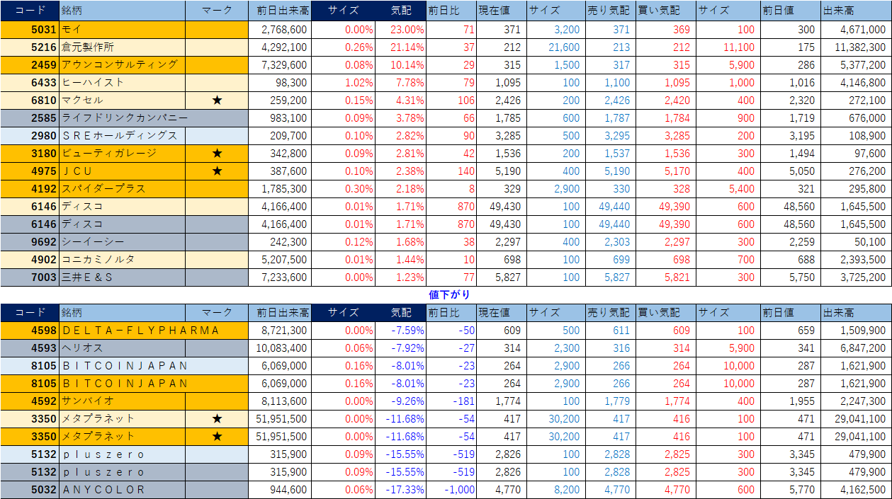 ホット銘柄-上げ銘柄&下げ銘柄(2025/12/11-前引け後) 投稿日: 2025年12月11日 投稿者: h_nagahama 「★」は昨日時点で注目した銘柄、「値上がり」にあれば伸びており、「値下がり」にあれば押しを形成している可能性。※銘柄の重複はお気にされずに。