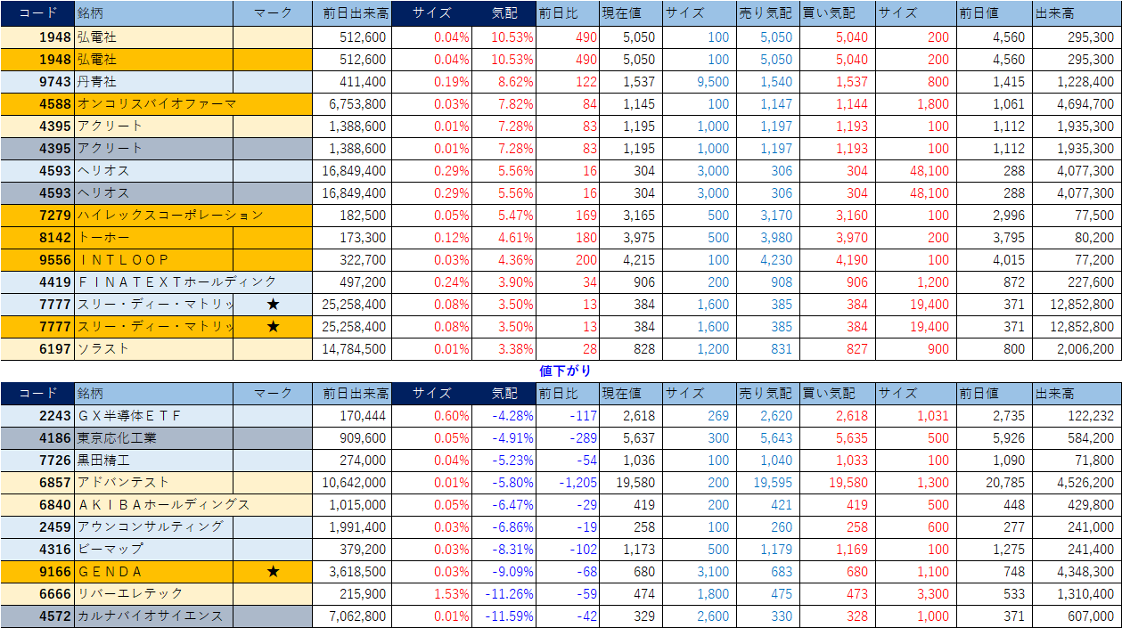 ホット銘柄-上げ銘柄&下げ銘柄(2025/12/15-前引け後) 投稿日: 2025年12月15日 投稿者: h_nagahama 「★」は昨日時点で注目した銘柄、「値上がり」にあれば伸びており、「値下がり」にあれば押しを形成している可能性。※銘柄の重複はお気にされずに。