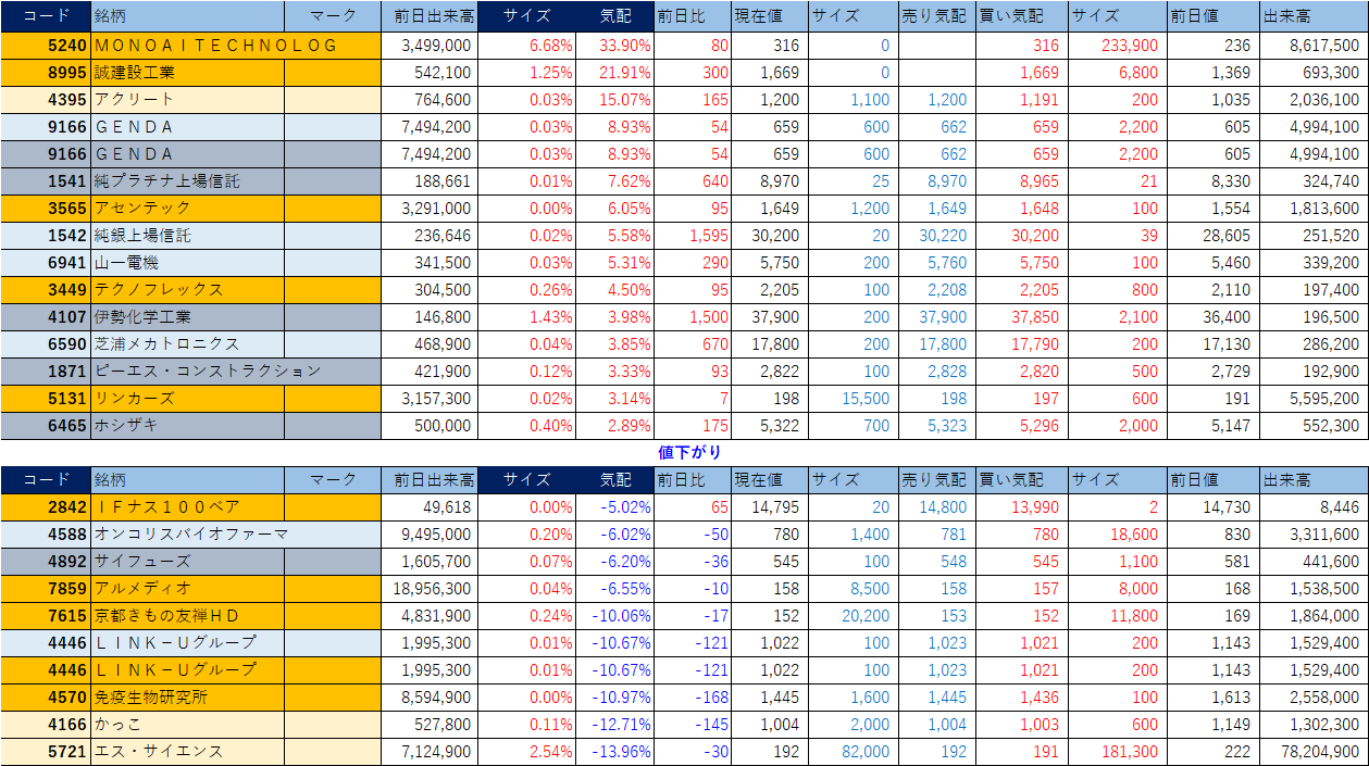 ホット銘柄-上げ銘柄&下げ銘柄(2025/12/17-大引け後) 投稿日: 2025年12月17日 投稿者: h_nagahama 「★」は昨日時点で注目した銘柄、「値上がり」にあれば伸びており、「値下がり」にあれば押しを形成している可能性。※銘柄の重複はお気にされずに。
