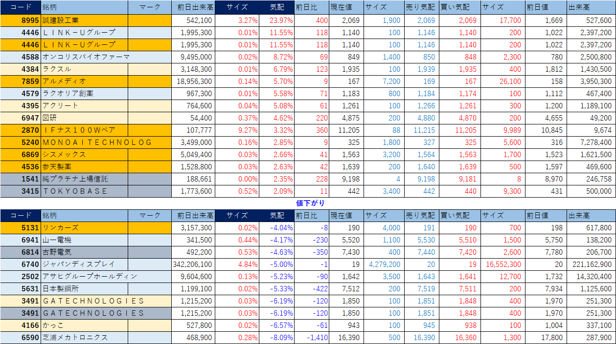 ホット銘柄-上げ銘柄&下げ銘柄(2025/12/18-前引け後) 投稿日: 2025年12月18日 投稿者: h_nagahama 「★」は昨日時点で注目した銘柄、「値上がり」にあれば伸びており、「値下がり」にあれば押しを形成している可能性。※銘柄の重複はお気にされずに。