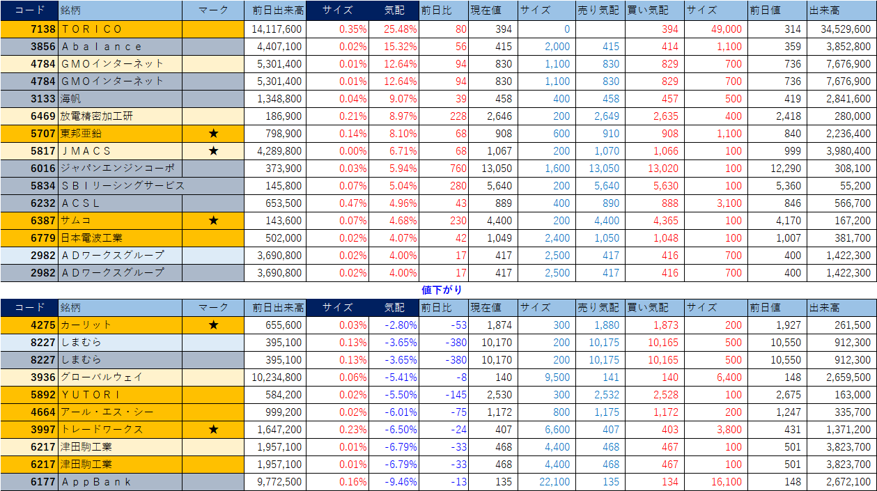 ホット銘柄-上げ銘柄&下げ銘柄(2025/12/23-大引け後) 投稿日: 2025年12月23日2025年12月23日 投稿者: h_nagahama 「★」は昨日時点で注目した銘柄、「値上がり」にあれば伸びており、「値下がり」にあれば押しを形成している可能性。※銘柄の重複はお気にされずに。