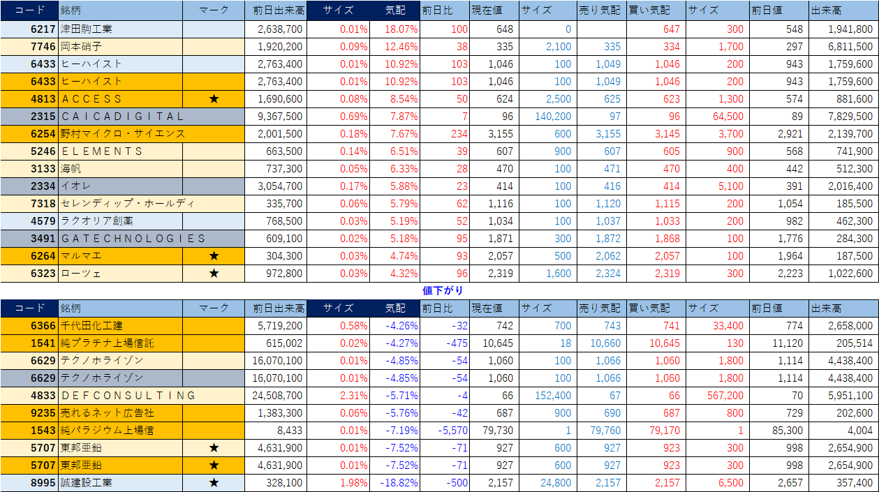 「★」は昨日時点で注目した銘柄、「値上がり」にあれば伸びており、「値下がり」にあれば押しを形成している可能性。※銘柄の重複はお気にされずに。