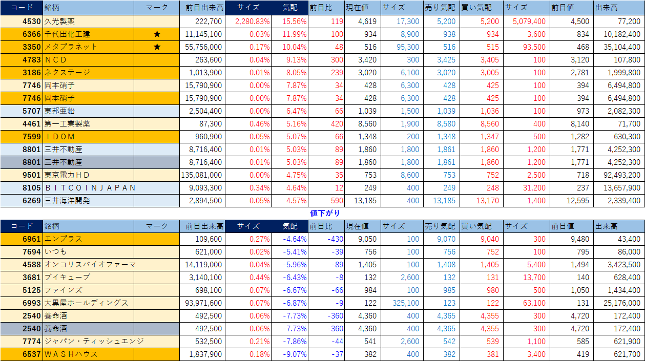 ホット銘柄-上げ銘柄&下げ銘柄(2026/01/06-前引け後) 投稿日: 2026年1月6日 投稿者: h_nagahama 「★」は昨日時点で注目した銘柄、「値上がり」にあれば伸びており、「値下がり」にあれば押しを形成している可能性。※銘柄の重複はお気にされずに。
