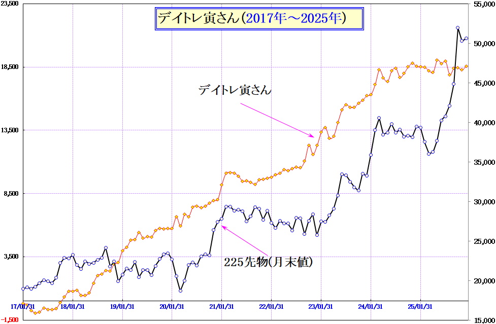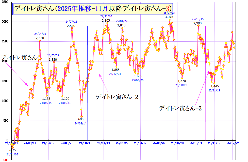 2025年11月よりデイトレ寅さん-3に移行、11月こそふらつきましたが12月に挽回。2025年トータルでは首の皮1枚、プラス域に浮上しました。が・・・これらのデータは実商いを掲載していますので2025年は実質、コスト(手数料)負け。