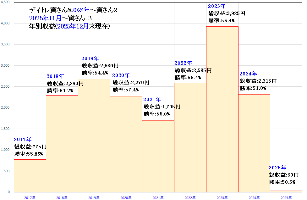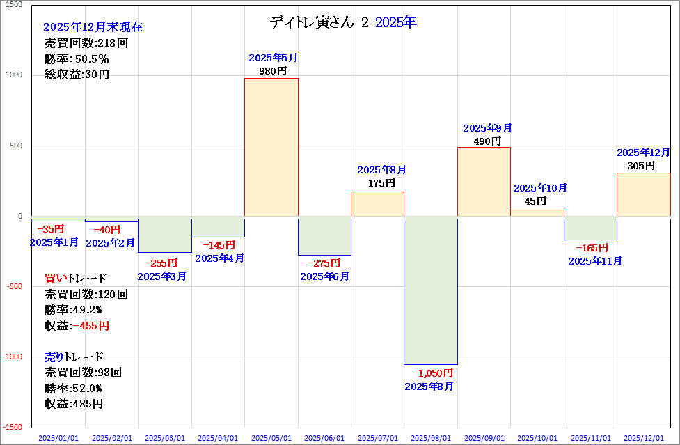 なお年間データについて、2025年は年間を通じて初めて「買いトレード」にてマイナスになるなど波乱の年となりましたが、こういった事が今後、デイトレ寅さん-3にて改善される事を期待します。