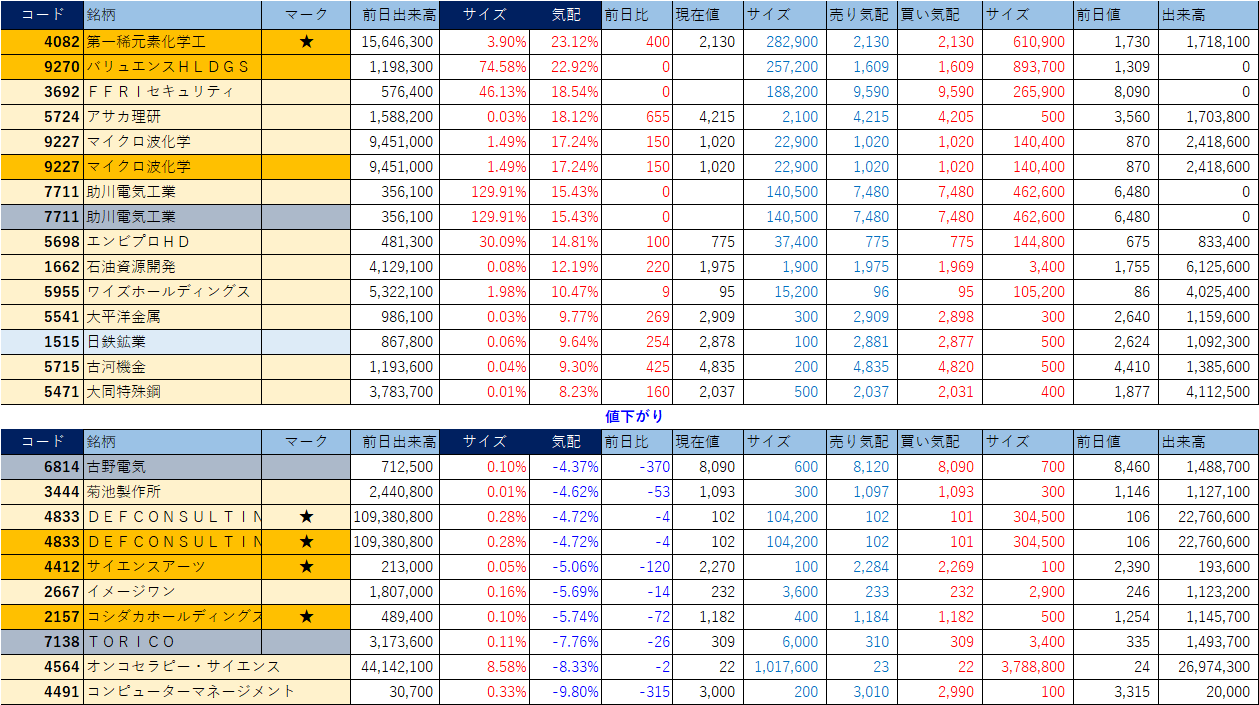 ホット銘柄-上げ銘柄&下げ銘柄(2026/01/13-前引け後) 投稿日: 2026年1月13日2026年1月13日 投稿者: h_nagahama 「★」は昨日時点で注目した銘柄、「値上がり」にあれば伸びており、「値下がり」にあれば押しを形成している可能性。※銘柄の重複はお気にされずに。