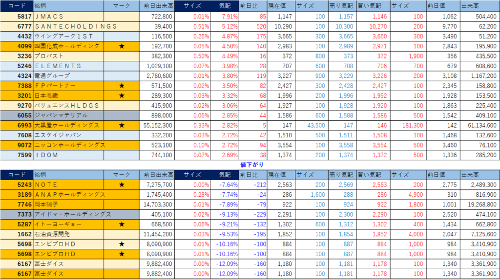ホット銘柄-上げ銘柄&下げ銘柄(2026/01/16-前引け後) 投稿日: 2026年1月16日2026年1月16日 投稿者: h_nagahama 「★」は昨日時点で注目した銘柄、「値上がり」にあれば伸びており、「値下がり」にあれば押しを形成している可能性。※銘柄の重複はお気にされずに。