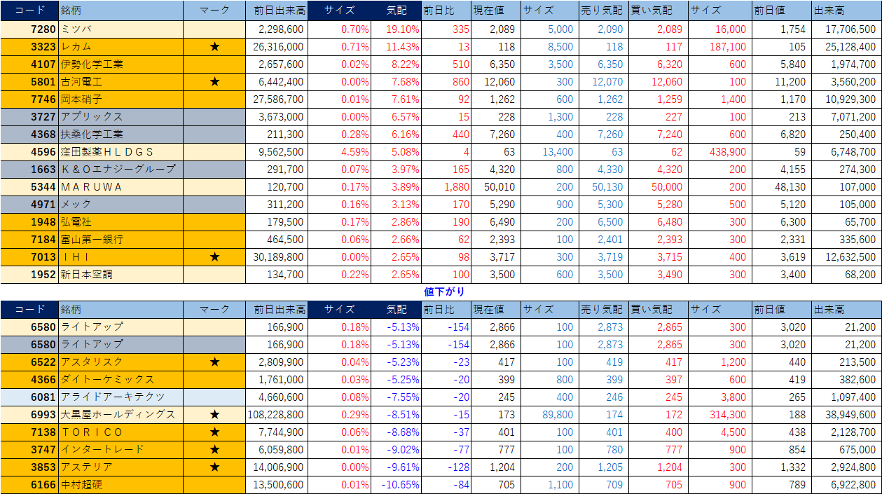 ホット銘柄-上げ銘柄&下げ銘柄(2026/01/21-前引け後) 投稿日: 2026年1月21日 投稿者: h_nagahama 「★」は昨日時点で注目した銘柄、「値上がり」にあれば伸びており、「値下がり」にあれば押しを形成している可能性。※銘柄の重複はお気にされずに。