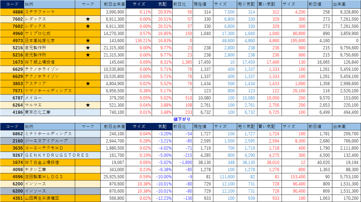 「★」は昨日時点で注目した銘柄、「値上がり」にあれば伸びており、「値下がり」にあれば押しを形成している可能性。※銘柄の重複はお気にされずに。
