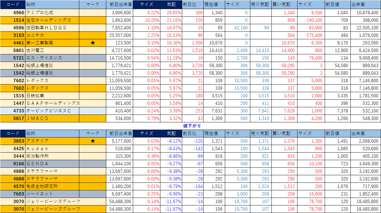 ホット銘柄-上げ銘柄&下げ銘柄(2026/01/28-大引け後) 投稿日: 2026年1月28日2026年1月28日 投稿者: h_nagahama 「★」は昨日時点で注目した銘柄、「値上がり」にあれば伸びており、「値下がり」にあれば押しを形成している可能性。※銘柄の重複はお気にされずに。