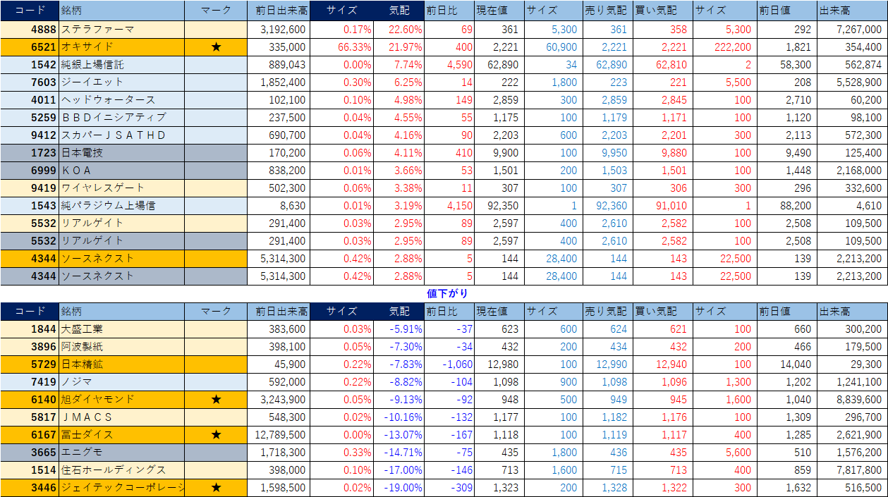 「★」は昨日時点で注目した銘柄、「値上がり」にあれば伸びており、「値下がり」にあれば押しを形成している可能性。※銘柄の重複はお気にされずに。