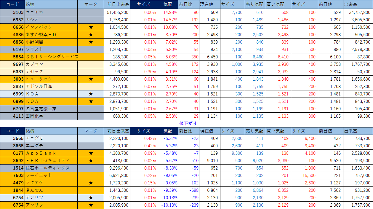 ホット銘柄-上げ銘柄&下げ銘柄(2026/01/30-前引け後) 投稿日: 2026年1月30日2026年1月30日 投稿者: h_nagahama 「★」は昨日時点で注目した銘柄、「値上がり」にあれば伸びており、「値下がり」にあれば押しを形成している可能性。※銘柄の重複はお気にされずに。