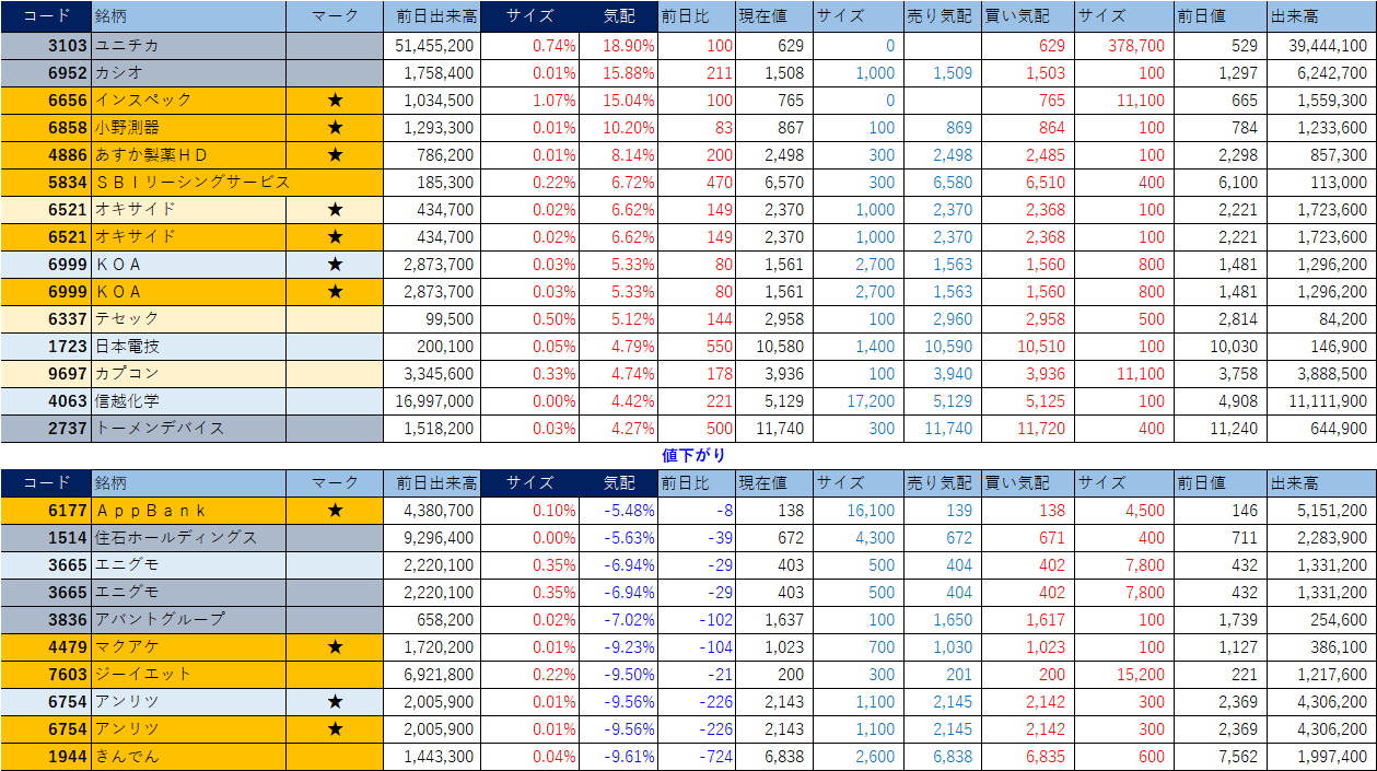 「★」は昨日時点で注目した銘柄、「値上がり」にあれば伸びており、「値下がり」にあれば押しを形成している可能性。※銘柄の重複はお気にされずに。