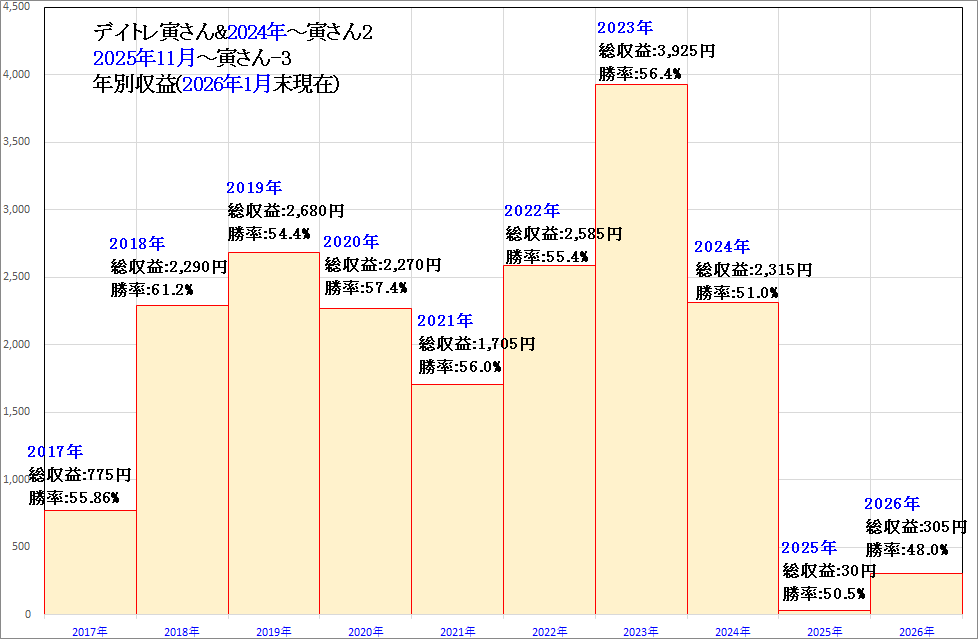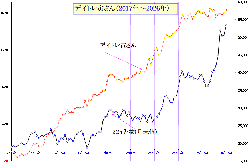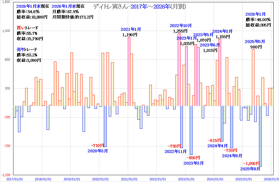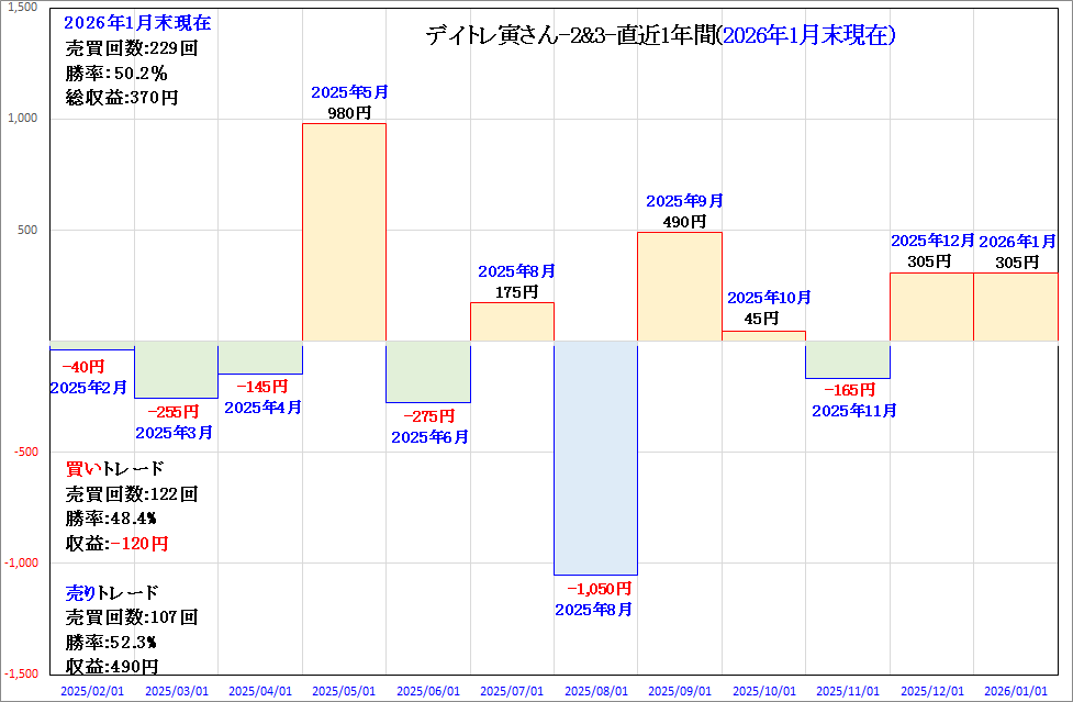 デイトレ寅さん-3(自動売買)2026/1報告 投稿日: 2026年2月4日2026年2月4日 投稿者: h_nagahama 2026年1月は225先物が14日に54,570円を付ける「上げ相場」に乗じて1月16日には一時、+1,055円幅まで収益を伸ばしましたが・・・そこから大きく上下に振る「揉み合い」で削られた格好。最終収益は305円幅にて終了。 ただし、デイトレ寅さん-2では参加しない「月前半」での収益化が実現できたことは収穫。今後もデイトレ寅さん-3の推移を見守ります。