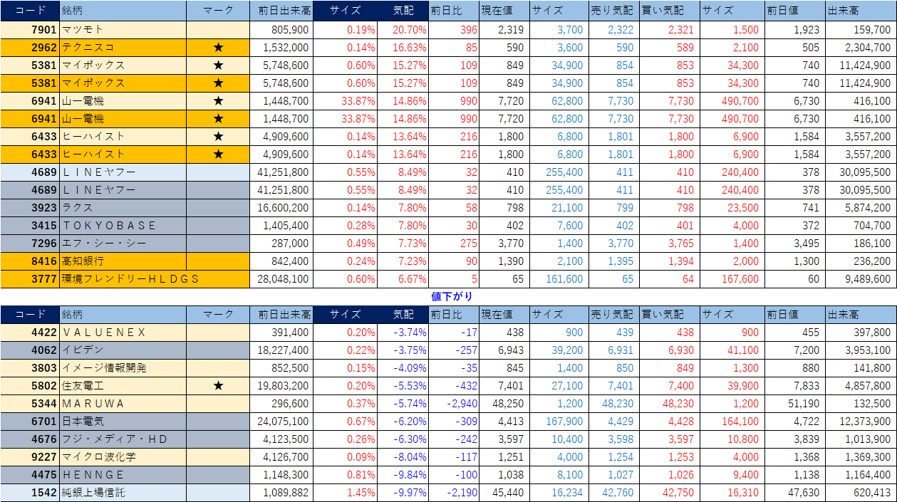 ホット銘柄-上げ銘柄&下げ銘柄(2026/02/05-前引け後) 投稿日: 2026年2月5日 投稿者: h_nagahama 「★」は昨日時点で注目した銘柄、「値上がり」にあれば伸びており、「値下がり」にあれば押しを形成している可能性。※銘柄の重複はお気にされずに。