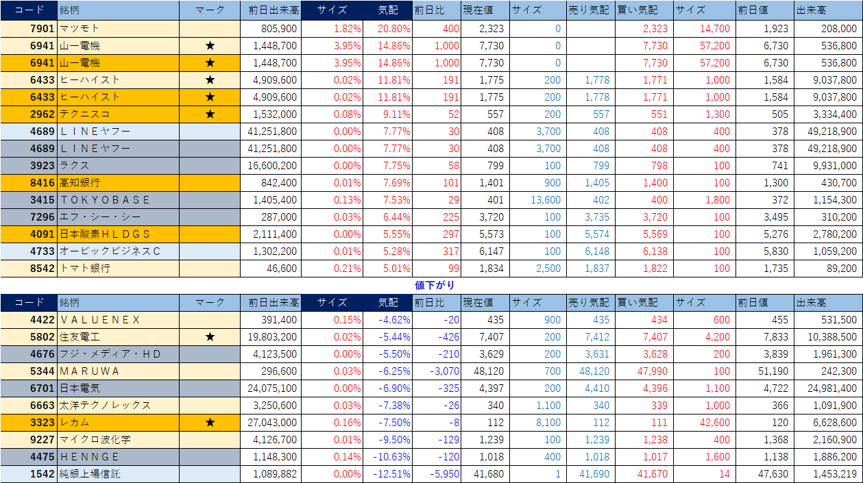 ホット銘柄-上げ銘柄&下げ銘柄(2026/02/05-大引け後) 投稿日: 2026年2月5日 投稿者: h_nagahama 「★」は昨日時点で注目した銘柄、「値上がり」にあれば伸びており、「値下がり」にあれば押しを形成している可能性。※銘柄の重複はお気にされずに。