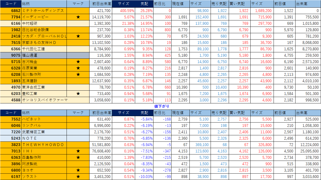 ホット銘柄-上げ銘柄&下げ銘柄(2026/02/12-前引け後) 投稿日: 2026年2月12日 投稿者: h_nagahama 「★」は昨日時点で注目した銘柄、「値上がり」にあれば伸びており、「値下がり」にあれば押しを形成している可能性。※銘柄の重複はお気にされずに。