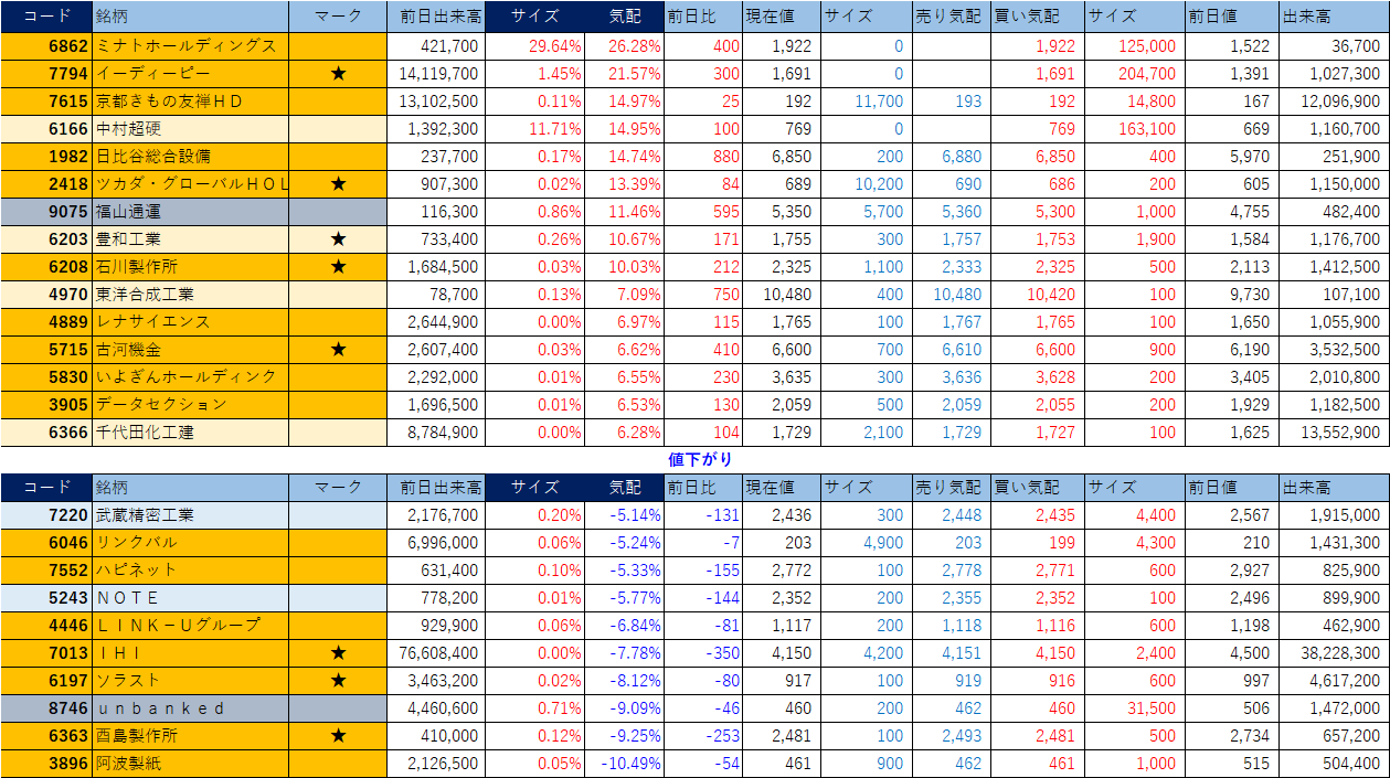 ホット銘柄-上げ銘柄&下げ銘柄(2026/02/12-大引け後) 投稿日: 2026年2月12日 投稿者: h_nagahama 「★」は昨日時点で注目した銘柄、「値上がり」にあれば伸びており、「値下がり」にあれば押しを形成している可能性。※銘柄の重複はお気にされずに。