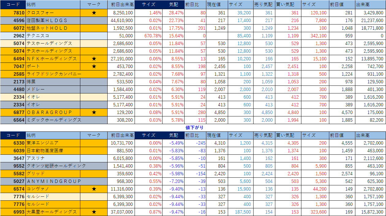 「★」は昨日時点で注目した銘柄、「値上がり」にあれば伸びており、「値下がり」にあれば押しを形成している可能性。※銘柄の重複はお気にされずに。