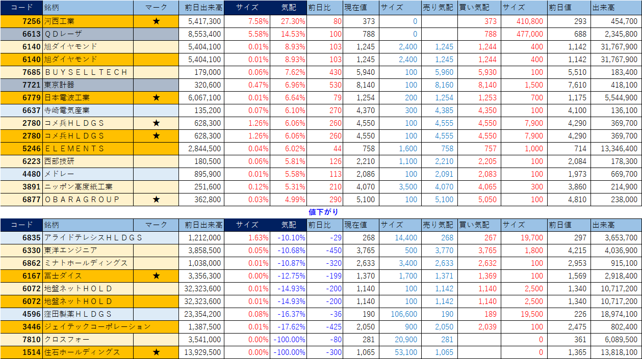 「★」は昨日時点で注目した銘柄、「値上がり」にあれば伸びており、「値下がり」にあれば押しを形成している可能性。※銘柄の重複はお気にされずに。