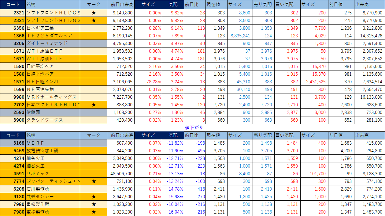 「★」は昨日時点で注目した銘柄、「値上がり」にあれば伸びており、「値下がり」にあれば押しを形成している可能性。※銘柄の重複はお気にされずに。