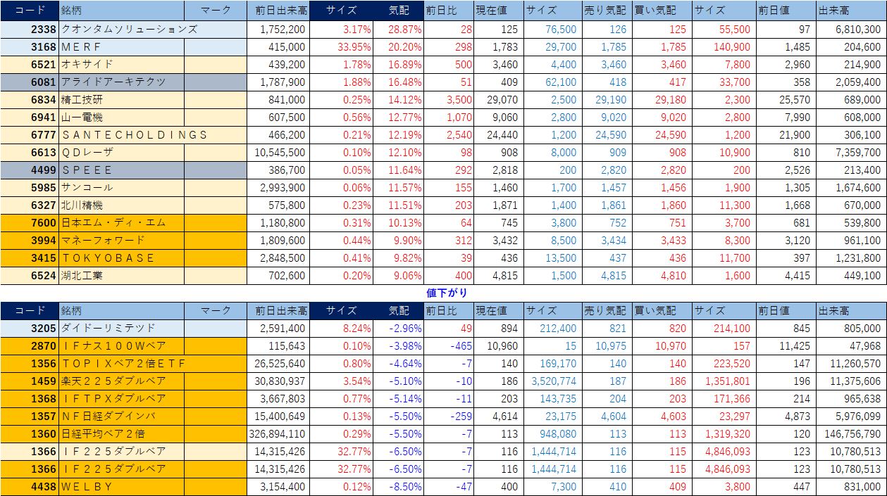 ホット銘柄-上げ銘柄&下げ銘柄(2026/03/05-前引け後) 投稿日: 2026年3月5日2026年3月5日 投稿者: h_nagahama 「★」は昨日時点で注目した銘柄、「値上がり」にあれば伸びており、「値下がり」にあれば押しを形成している可能性。※銘柄の重複はお気にされずに。