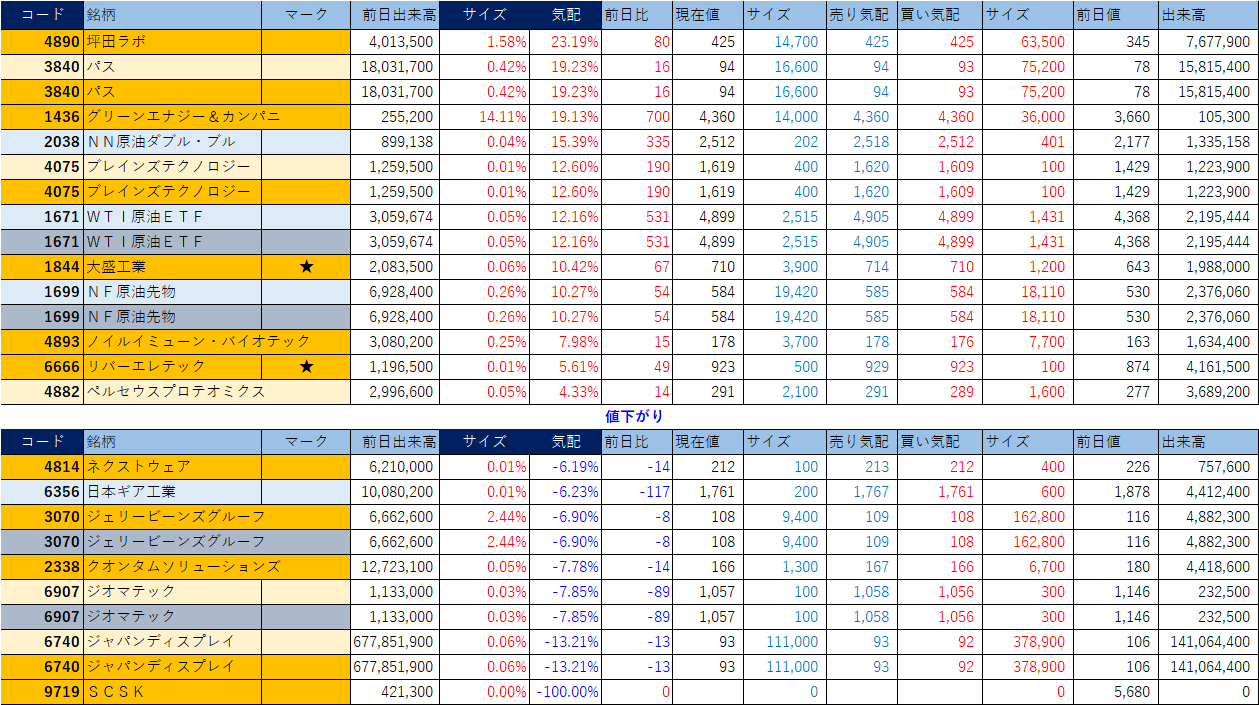 「★」は昨日時点で注目した銘柄、「値上がり」にあれば伸びており、「値下がり」にあれば押しを形成している可能性。※銘柄の重複はお気にされずに。