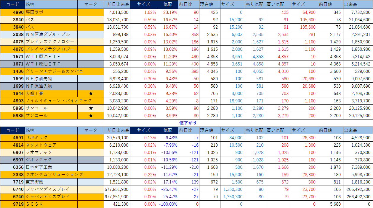 「★」は昨日時点で注目した銘柄、「値上がり」にあれば伸びており、「値下がり」にあれば押しを形成している可能性。※銘柄の重複はお気にされずに。