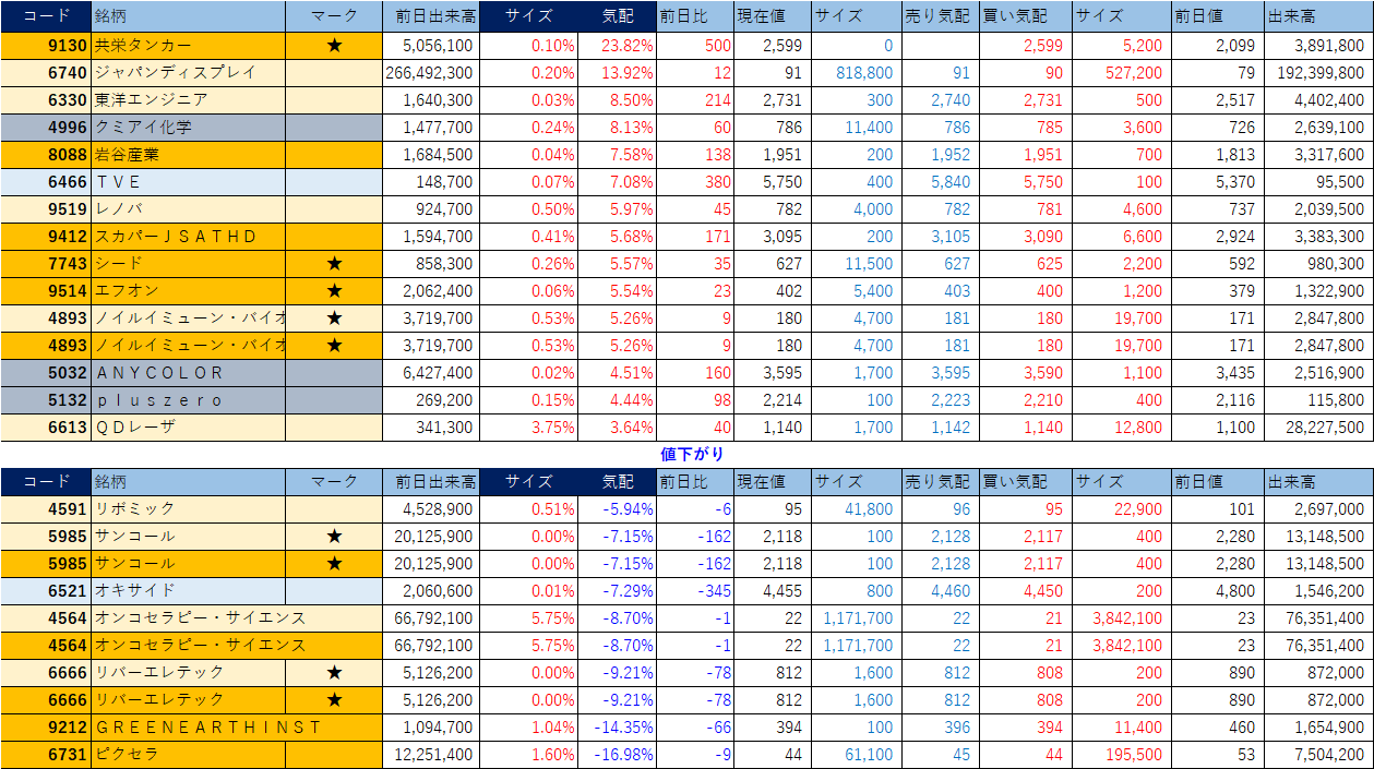 「★」は昨日時点で注目した銘柄、「値上がり」にあれば伸びており、「値下がり」にあれば押しを形成している可能性。※銘柄の重複はお気にされずに。