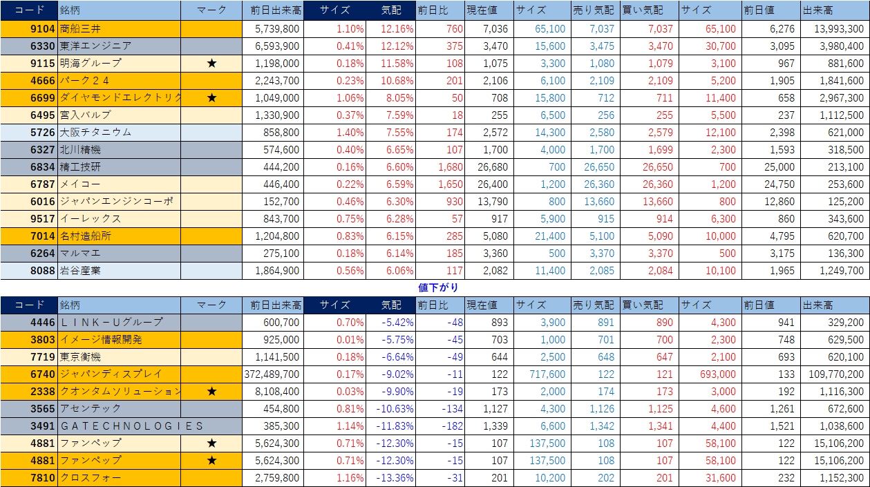 ホット銘柄-上げ銘柄&下げ銘柄(2026/03/18-前引け後) 投稿日: 2026年3月18日2026年3月18日 投稿者: h_nagahama 「★」は昨日時点で注目した銘柄、「値上がり」にあれば伸びており、「値下がり」にあれば押しを形成している可能性。※銘柄の重複はお気にされずに。