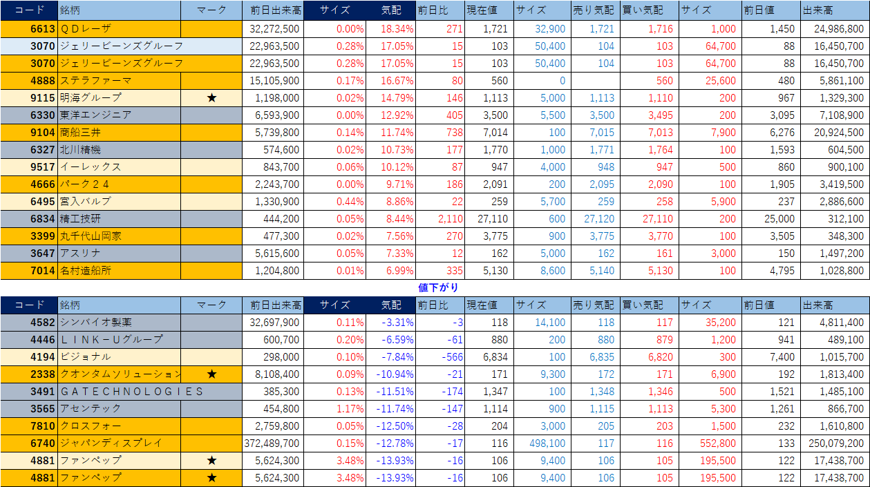 「★」は昨日時点で注目した銘柄、「値上がり」にあれば伸びており、「値下がり」にあれば押しを形成している可能性。※銘柄の重複はお気にされずに。