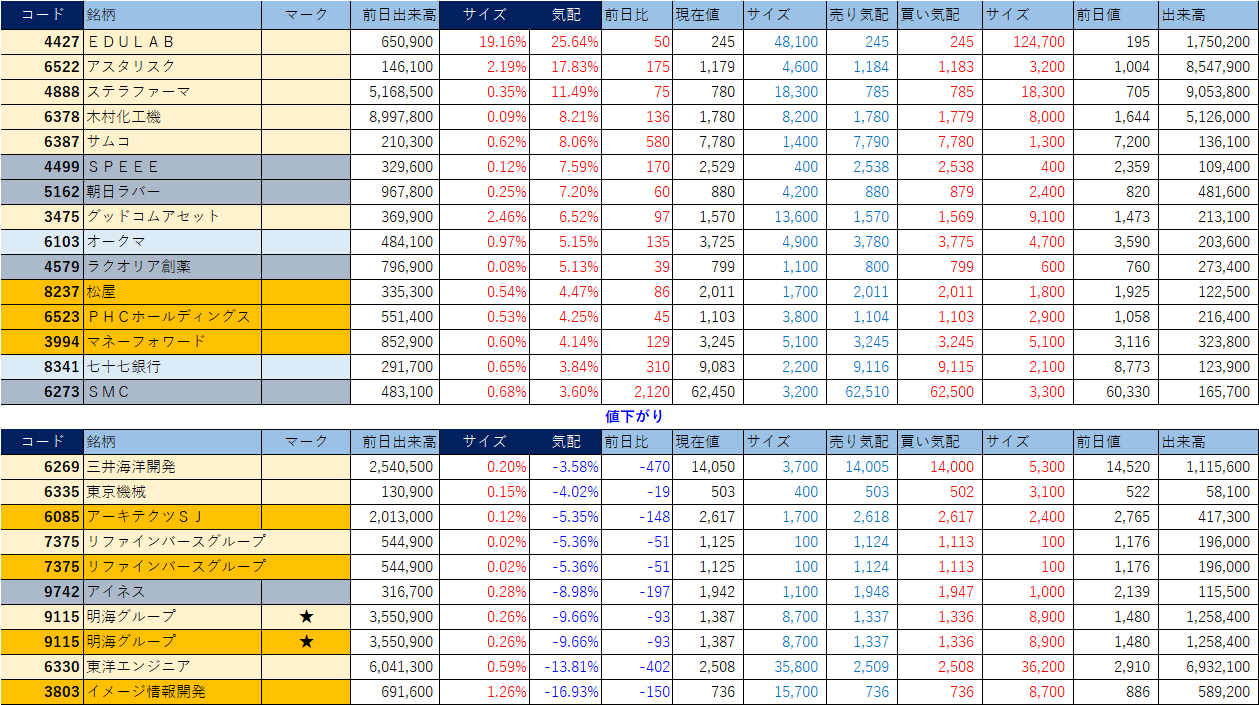 「★」は昨日時点で注目した銘柄、「値上がり」にあれば伸びており、「値下がり」にあれば押しを形成している可能性。※銘柄の重複はお気にされずに。