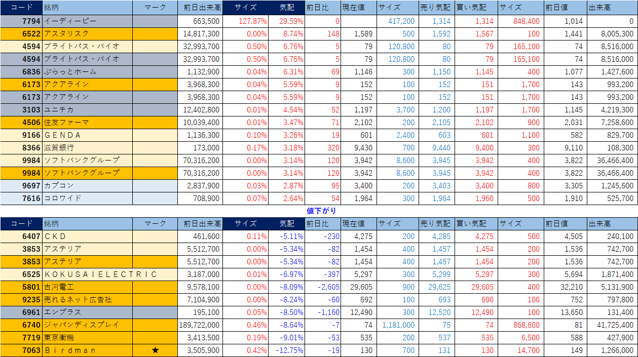 「★」は昨日時点で注目した銘柄、「値上がり」にあれば伸びており、「値下がり」にあれば押しを形成している可能性。※銘柄の重複はお気にされずに。