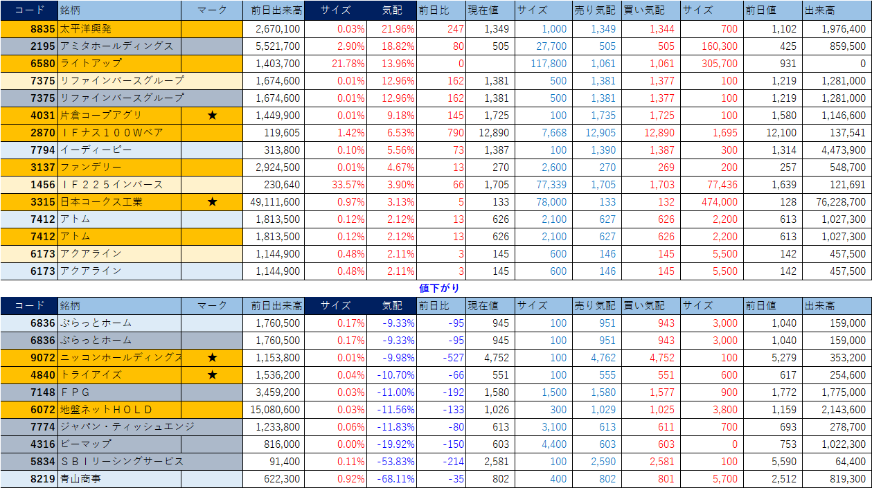 ホット銘柄-上げ銘柄&下げ銘柄(2026/03/30-前引け後) 投稿日: 2026年3月30日2026年3月30日 投稿者: h_nagahama 「★」は昨日時点で注目した銘柄、「値上がり」にあれば伸びており、「値下がり」にあれば押しを形成している可能性。※銘柄の重複はお気にされずに。
