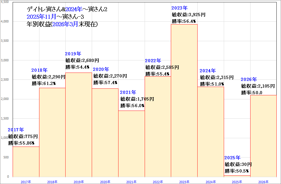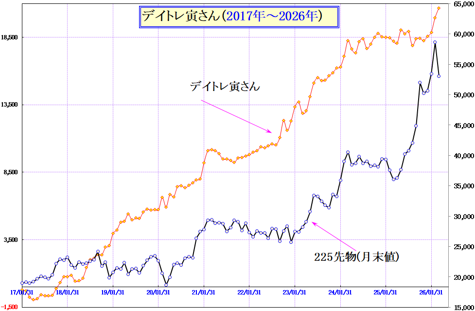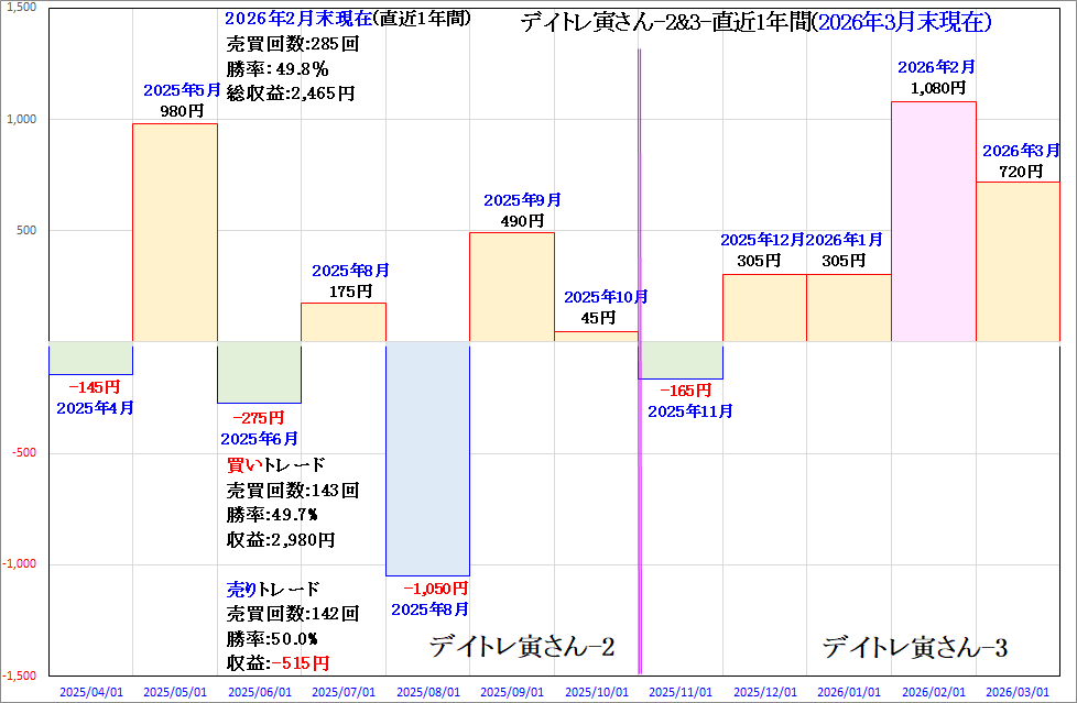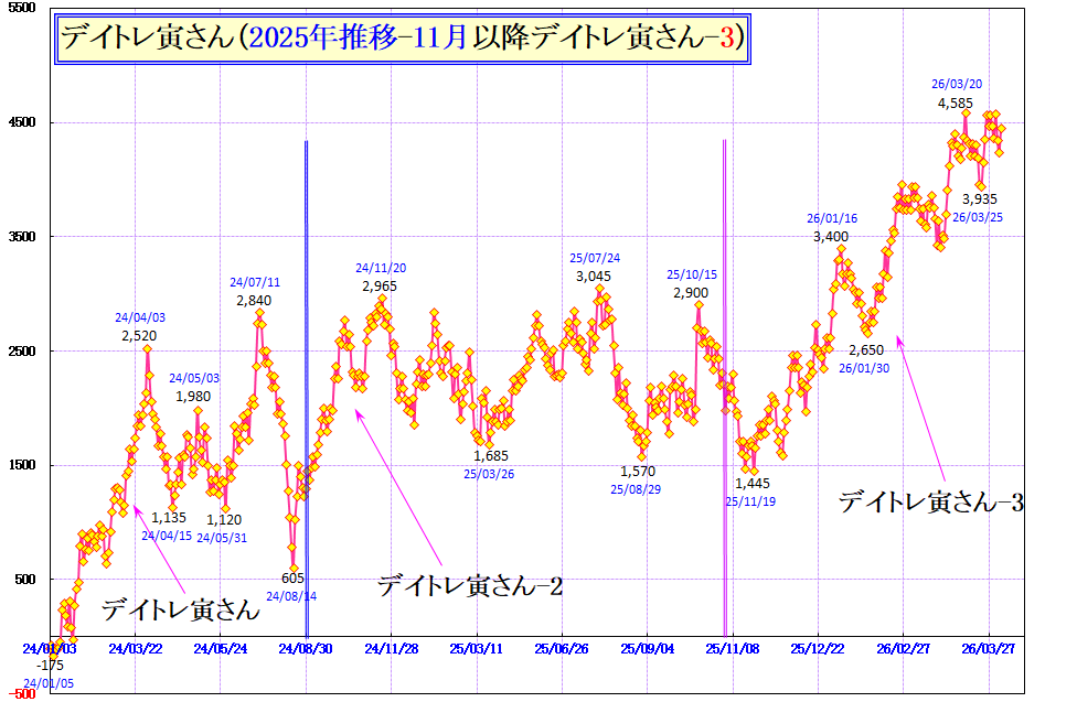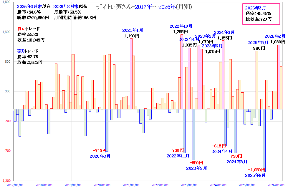 デイトレ寅さん-3(自動売買)2026/3報告 投稿日: 2026年4月1日 投稿者: h_nagahama 2026年3月は総じて乱高下を日常とする調整相場、高ボラティリティの中で過去最高の売買回数を記録。 先物ベースで59,700円~50,480円まで下落相場の中、結果としてはよく闘ったとも言えます。が、売りは条件発動時には「返り」が発生する事が頻発、ヤラレが目立つ月に。