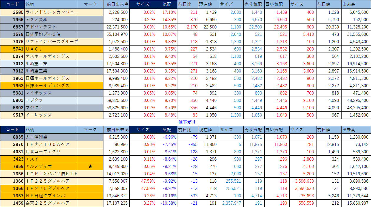 「★」は昨日時点で注目した銘柄、「値上がり」にあれば伸びており、「値下がり」にあれば押しを形成している可能性。※銘柄の重複はお気にされずに。