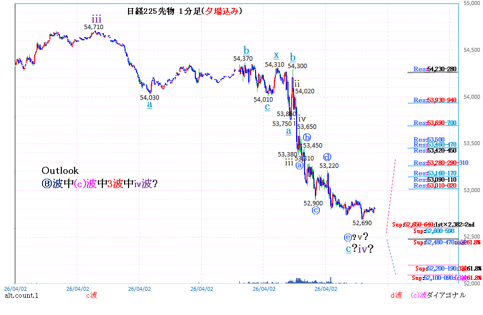 ★54,710円以来はダブルスリー(ジグザグ+フラット)を描いている可能性、小難しい話を横に置けば52,690円安値現在、53,010円~020円、53,090円~110円は強くかつ重要なレジスタンス。上限アップは「52,690円、良いトコロ」を暗示する最初のサイン。
