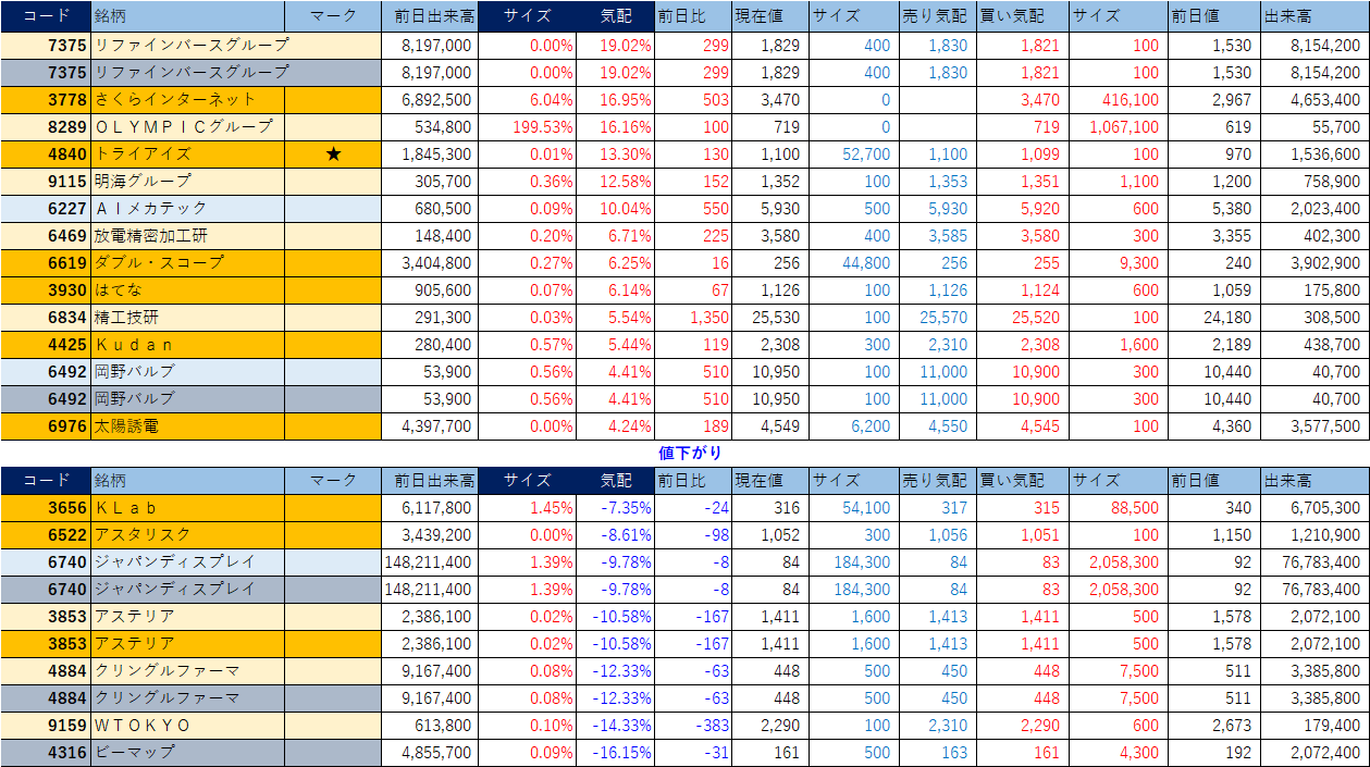「★」は昨日時点で注目した銘柄、「値上がり」にあれば伸びており、「値下がり」にあれば押しを形成している可能性。※銘柄の重複はお気にされずに。